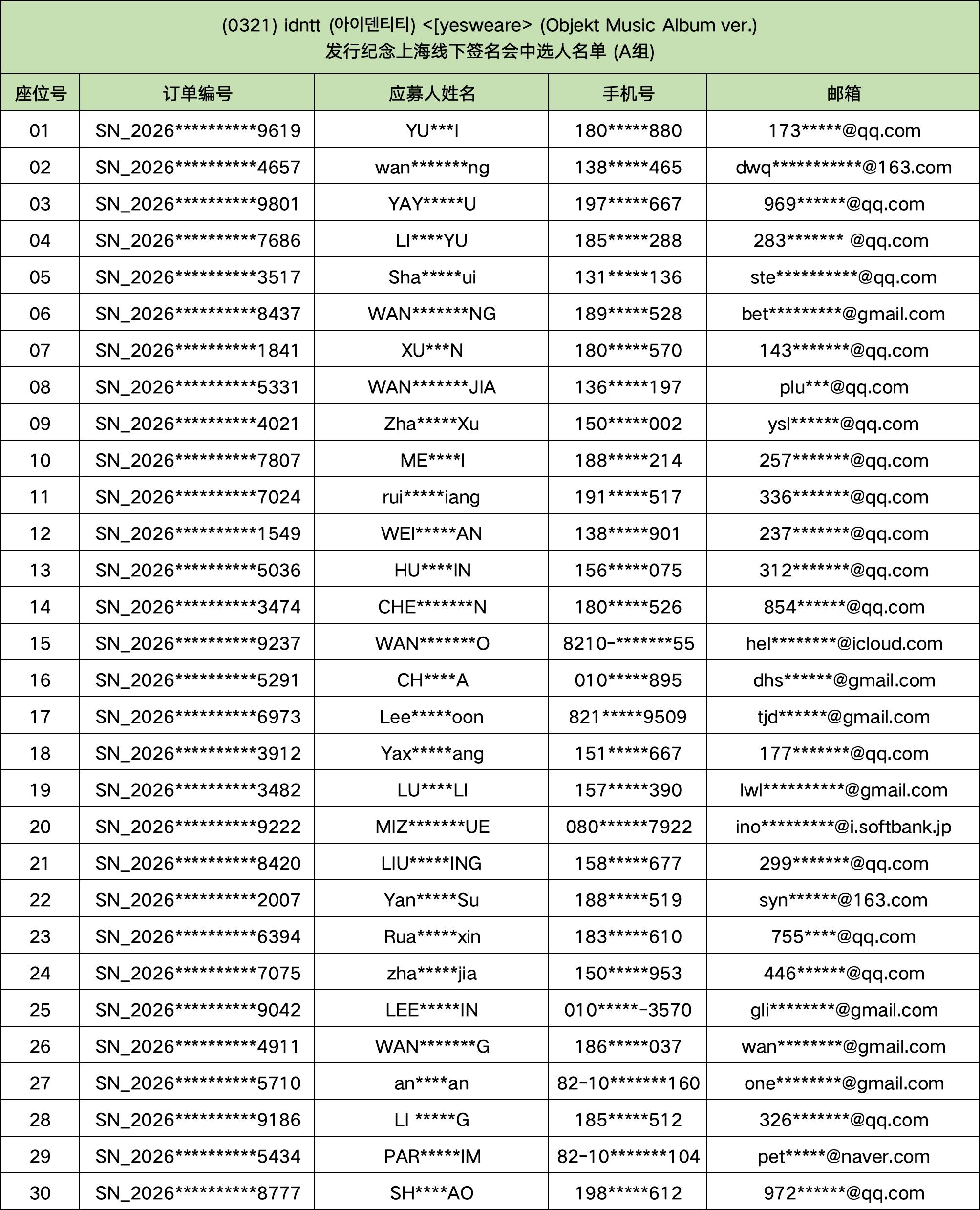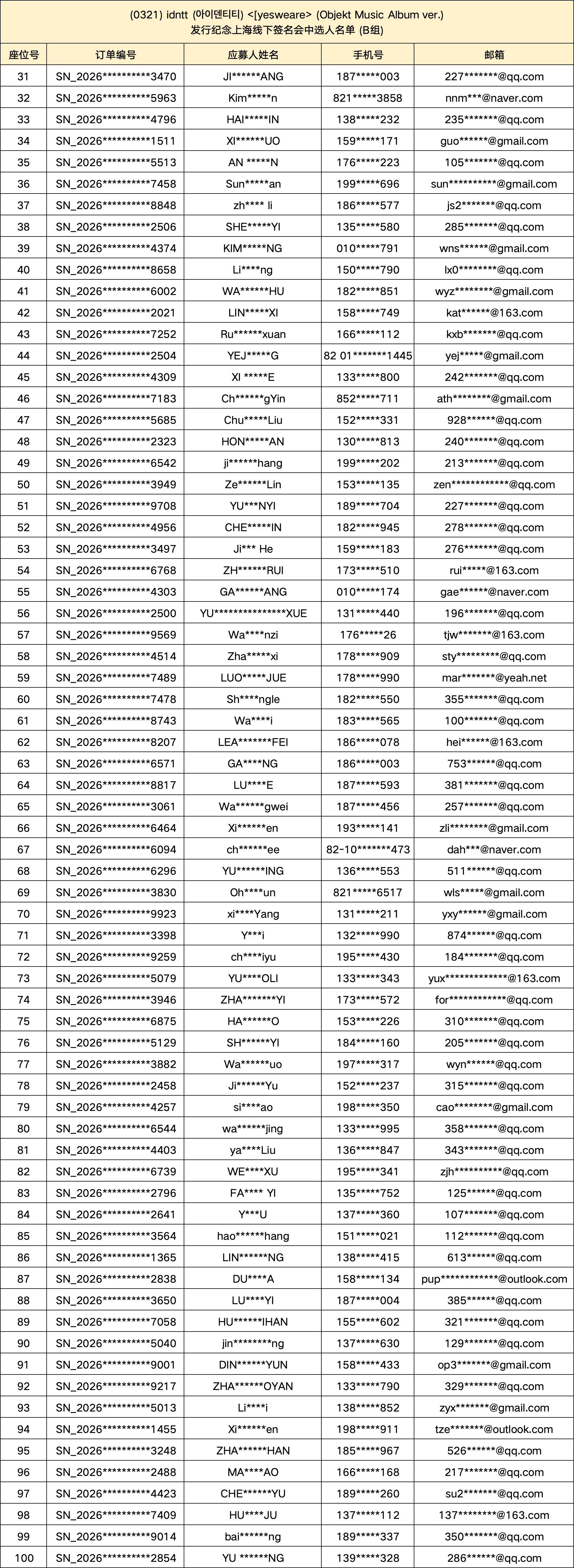 – 在签名会活动进行中请坐在自己号码的位置上。当出现私自交换号码或座位、 不按照自己号码排队、不听从现场工作人员指挥的情况,将被视作拒绝配合,而不能获得签名、 HI BYE 等福利。