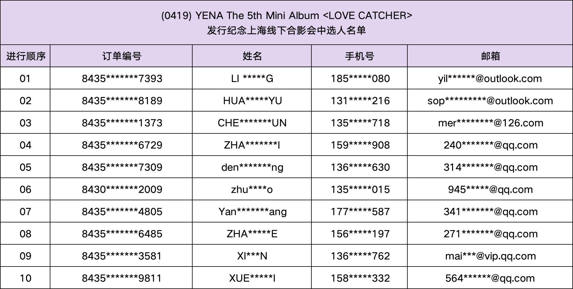 恭喜您中选 (0419) YENA - 迷你5辑 <LOVE CATCHER> 发行纪念上海线下合影会。