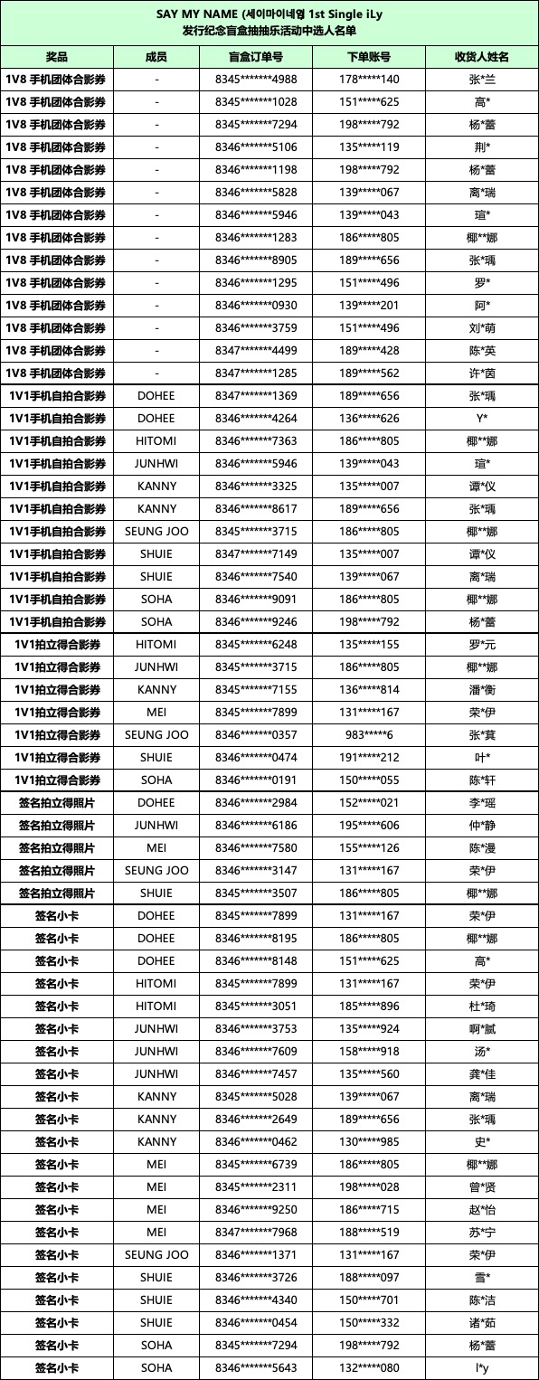 恭喜您中选 (9/20) SAY MY NAME - 1st Single iLy 发行纪念盲盒抽抽乐活动。