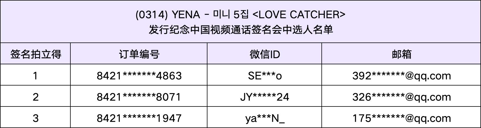恭喜您中选 (0314) YENA - 迷你5辑 <LOVE CATCHER> 发行纪念中国视频通话签名会。